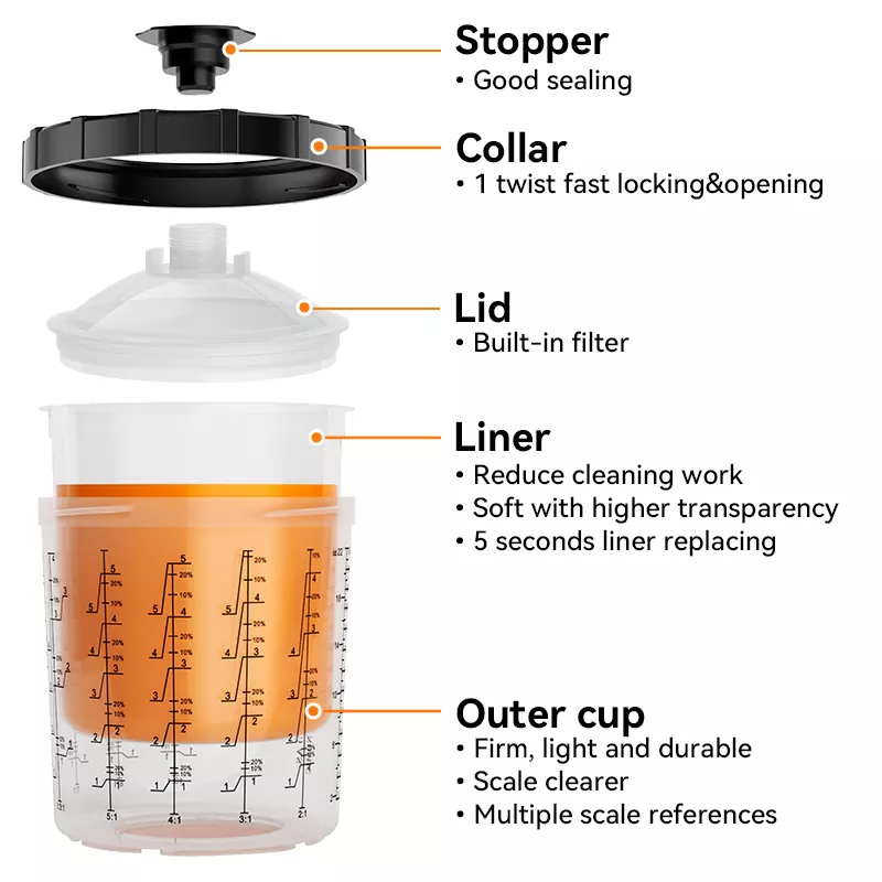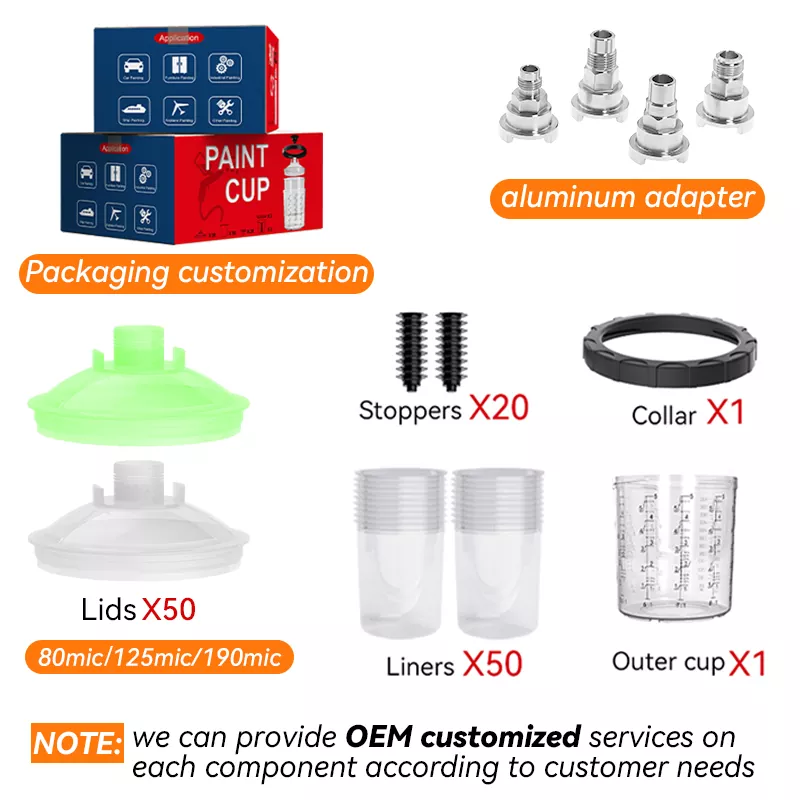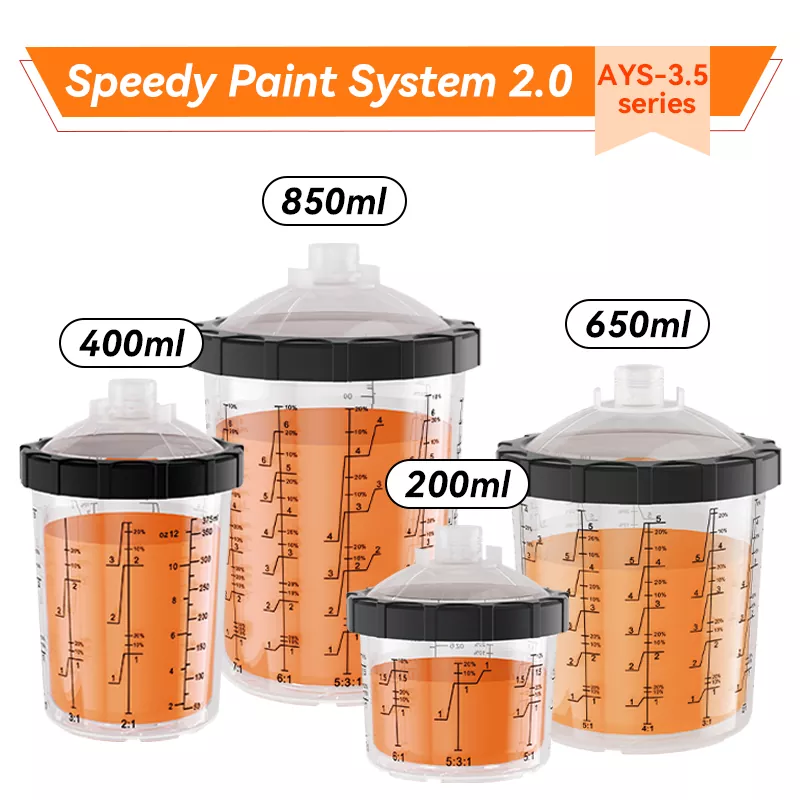AYSPAT 200ML Speedy Paint System 2.0 es una versión mejorada de la serie 1.0 original. A través de la optimización estructural basada en la serie PPS 1.0, logra mayores mejoras de rendimiento. El sistema de pintura rápida AYS3.5 se puede utilizar en combinación con el adaptador de la serie AYS3.0 para conectarse con varios tipos de pistolas pulverizadoras. Como fábrica de vasos de pintura desechables de China, producimos vasos de pintura en aerosol de alta calidad y admitimos la producción personalizada de OEM y ODM. Si desea comprar un vaso de pintura desechable, envíenos una consulta y le proporcionaremos una cotización.