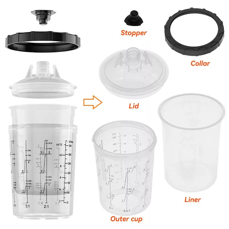 Este producto básicamente reemplaza la taza de alimentación de gravedad tradicional porque no solo ahorra más pintura, sino que también mejora la eficiencia de la pintura. Específicamente, el diseño exquisito de la espiral automática del revestimiento cuando la pintura hace que la pintura se utilice completamente; Mientras tanto, el diseño de reemplazo de revestimiento de bloqueo más rápido de bloqueo evita lavar la taza, lo que permite que el trabajo de pintura se realice de manera eficiente y repetida. Tenemos adaptadores para casi todas las marcas de pistola de pulverización en el mercado para satisfacer las necesidades de experiencia de diferentes entusiastas de las pistolas de pulverización. El adaptador está hecho de acero inoxidable, que es resistente a la corrosión de la pintura y muy duradero. La combinación ajustada del revestimiento con la tapa asegura que el sistema de copa no filtre pintura mientras pinta, y admite el almacenamiento a largo plazo de pintura no utilizada para evitar los desechos.