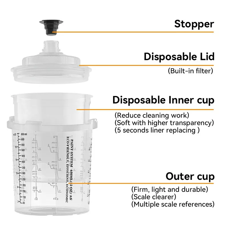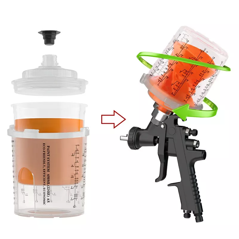 -La ventana de corte en la taza dura le permite monitorear fácilmente el nivel de pintura en cualquier momento, y la tapa de la copa se puede quitar fácilmente agarrando el revestimiento a través del cuerpo de la copa cuando se rellena o teñido de pintura.