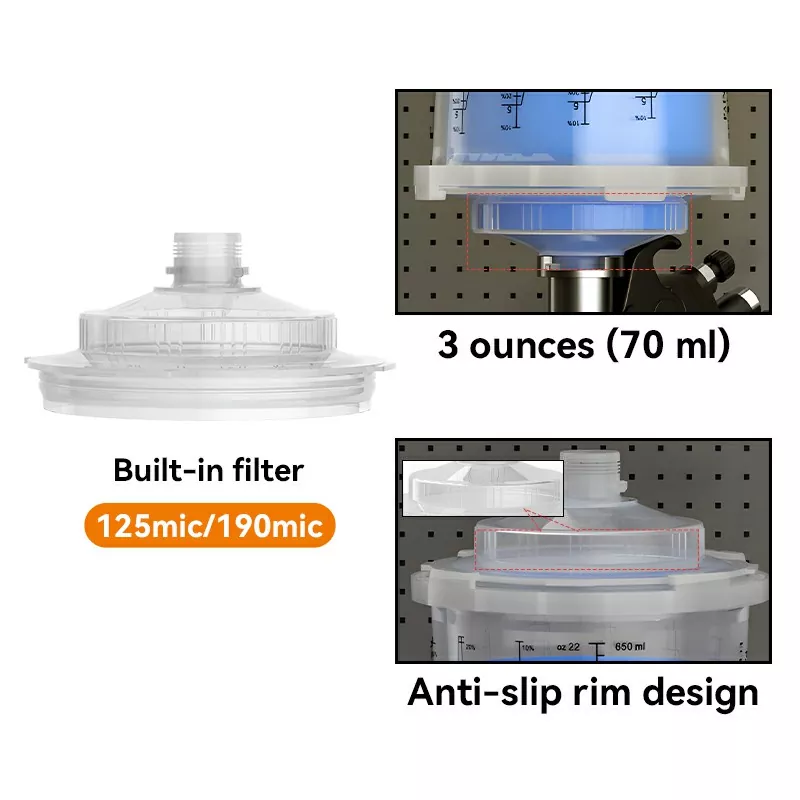 -La tapa de copa de rociado desechable Ays3.1 cuenta con una construcción de doble capa que tiene hasta 3 onzas (70 ml) de pintura debajo del filtro. La tapa mejora el flujo de pintura y la consistencia, reduciendo la salpicadura de la pintura.