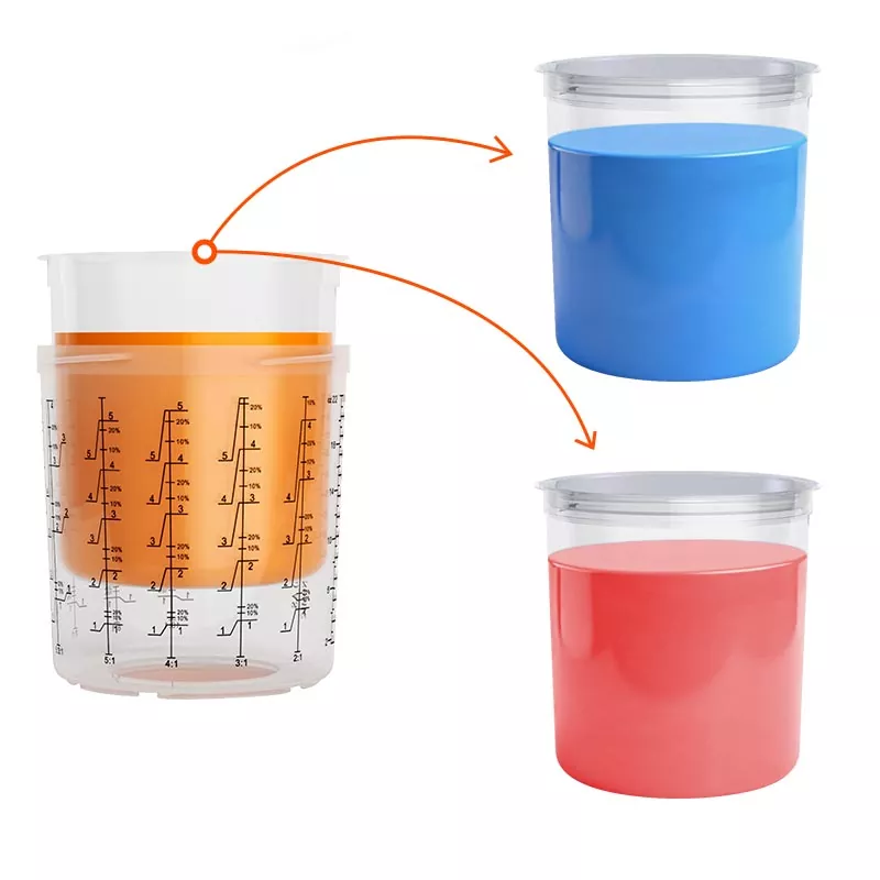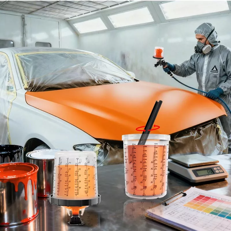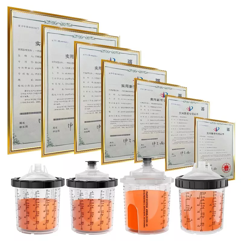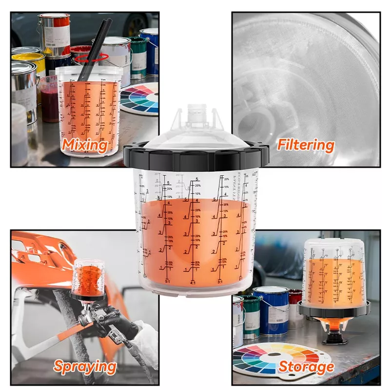 El sistema de vaso de pintura desechable combina funciones de mezcla, filtrado, pulverización y almacenamiento en una sola unidad. Esto no solo simplifica la preparación previa a la pintura, sino que también ahorra el costo de mezclar vasos y embudos de papel, lo que los convierte en la opción perfecta para ahorrar tiempo de preparación y mejorar la eficiencia de la pulverización.
