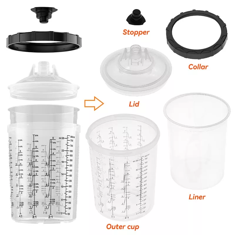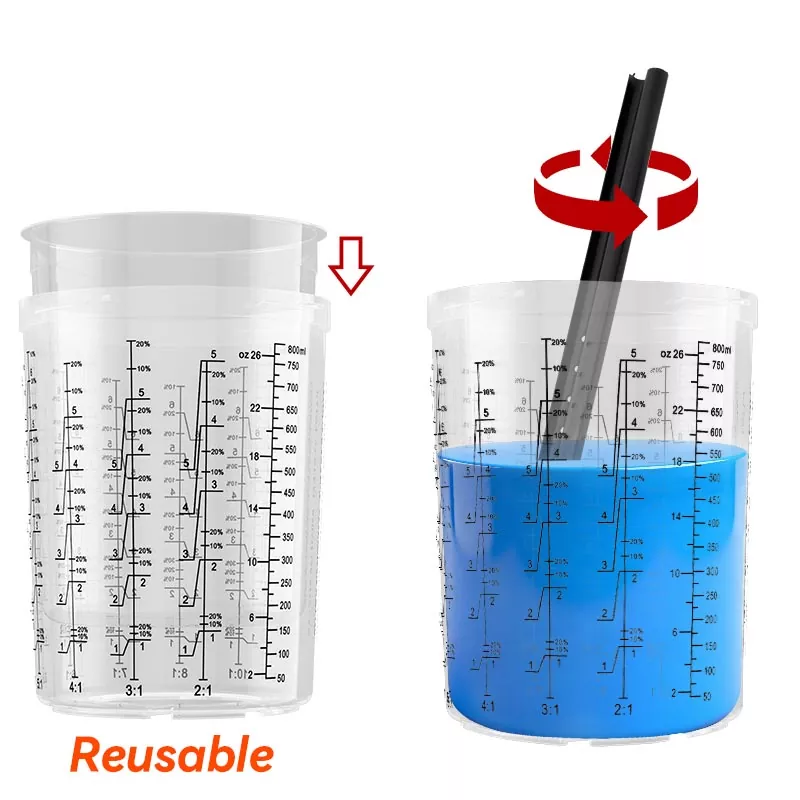 Copa externa reutilizable con escala de relación de mezcla. Inserte el revestimiento desechable en la taza externa y mezcle la pintura directamente en el revestimiento. Reduzca el costo del material al no usar una copa de mezcla tradicional.