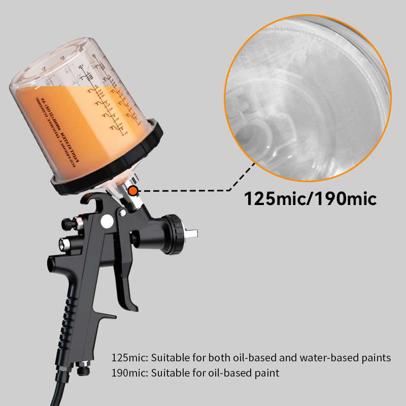 • Filtros integrados incorporados para un acabado de pintura superior: La tapa del recipiente pulverizador desechable cuenta con filtros integrados de 190 μ (pintura a base de aceite) y 125 μ (pintura a base de agua), que filtran eficazmente las impurezas durante la pulverización y aumentan el brillo de la pintura en un 20 %.